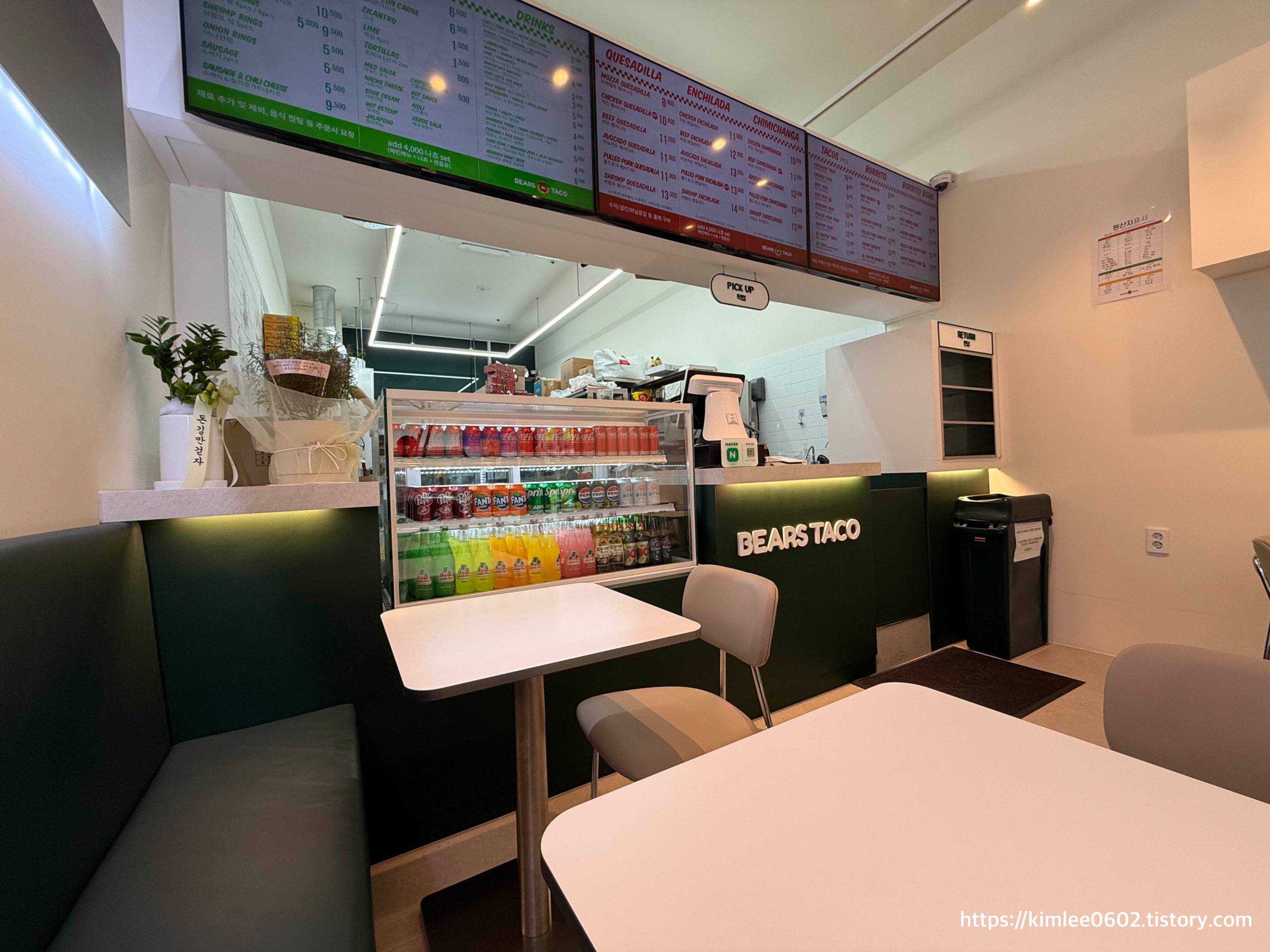 베어스 타코 영통점은 키오스크 시스템을 통해 주문할 수 있으며, 음식은 셀프 픽업 방식입니다. 음식이 준비되면 진동벨로 알림을 주기 때문에 편리하게 음식을 받을 수 있습니다.